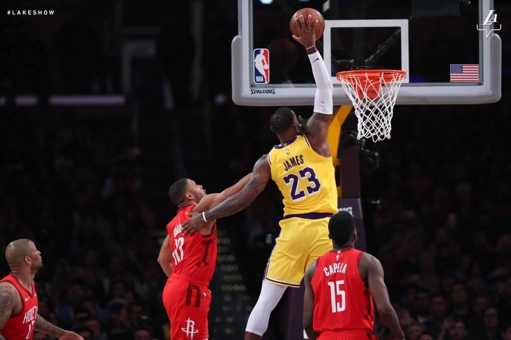 第二节,湖人外线频频打铁导致全队情绪低落,火箭则越战越勇,保罗急停跳投得手,哈登也三分颜射詹姆斯,法里德和卡佩拉两代饼皇不仅进攻端互相喂饼扣篮,防守端更是双鬼拍门送上封盖打停湖人。暂停回来,詹姆斯突然发力连投带传帮助湖人稳住局势。