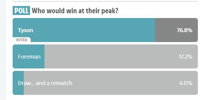 关于福尔曼和泰森谁更厉害谁能获胜的问题,有媒体还专门做了一个调查,结果根据投票显示,76.8%的拳迷都认为泰森可以击败福尔曼。这可是一个碾压的优势啊,非常不可思议。看来,泰森在拳迷心中,还是勇猛无敌的,任何人都不可能对巅峰时期的泰森构成威胁。