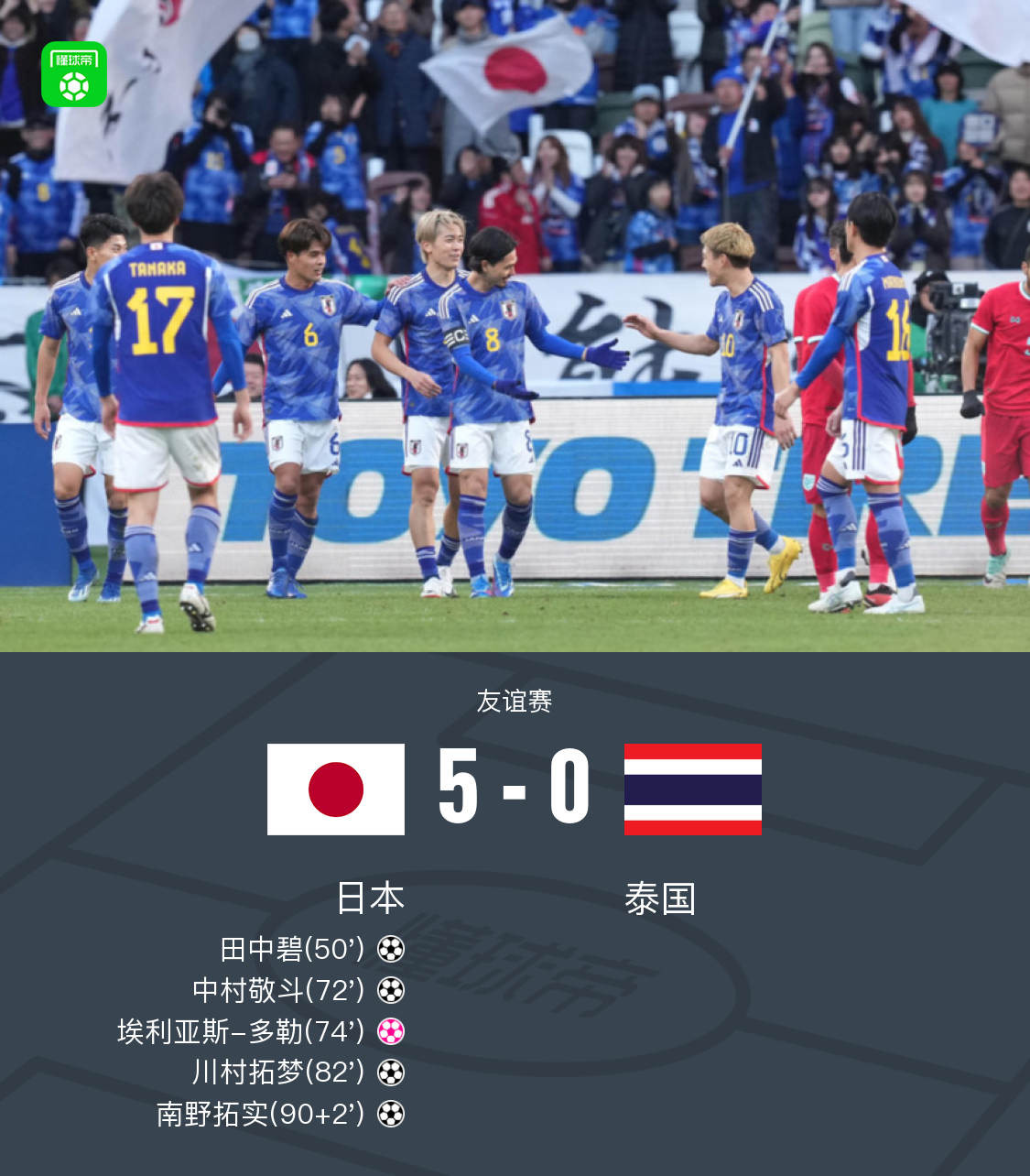 北京时间1月1日友谊赛,日本主场对阵泰国。比赛第50分钟,田中碧率先破门,第72分钟,中村敬斗再下一城,第74分钟,埃利亚斯-多勒不幸自摆乌龙,第82分钟,川村拓梦头球二连击得分,补时第2分钟,南野拓实捅射进球。最终比分日本5- 0泰国。