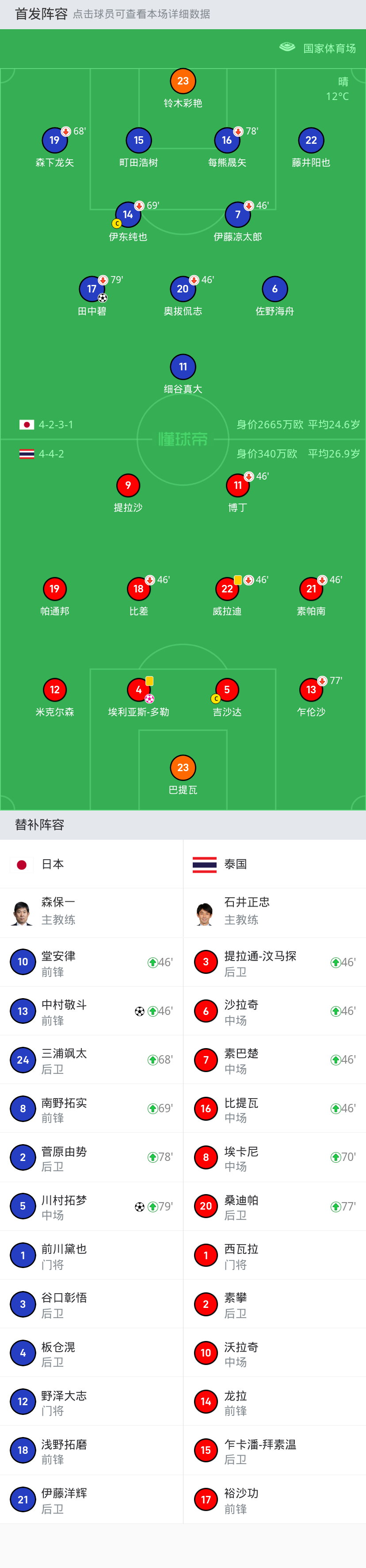 赛后泰国队主帅石井正忠接受采访时对比赛进行总结,他说道:“能够元旦在国立竞技场与日本队交手,对于泰国队来说真的是非常棒的一段体验。尽管遭遇大败,但正如昨天发布会上所说的,不管被进几个球也不会低头,继续发起挑战,因此我对球队的表现感到自豪,球队坚持到了最后。”