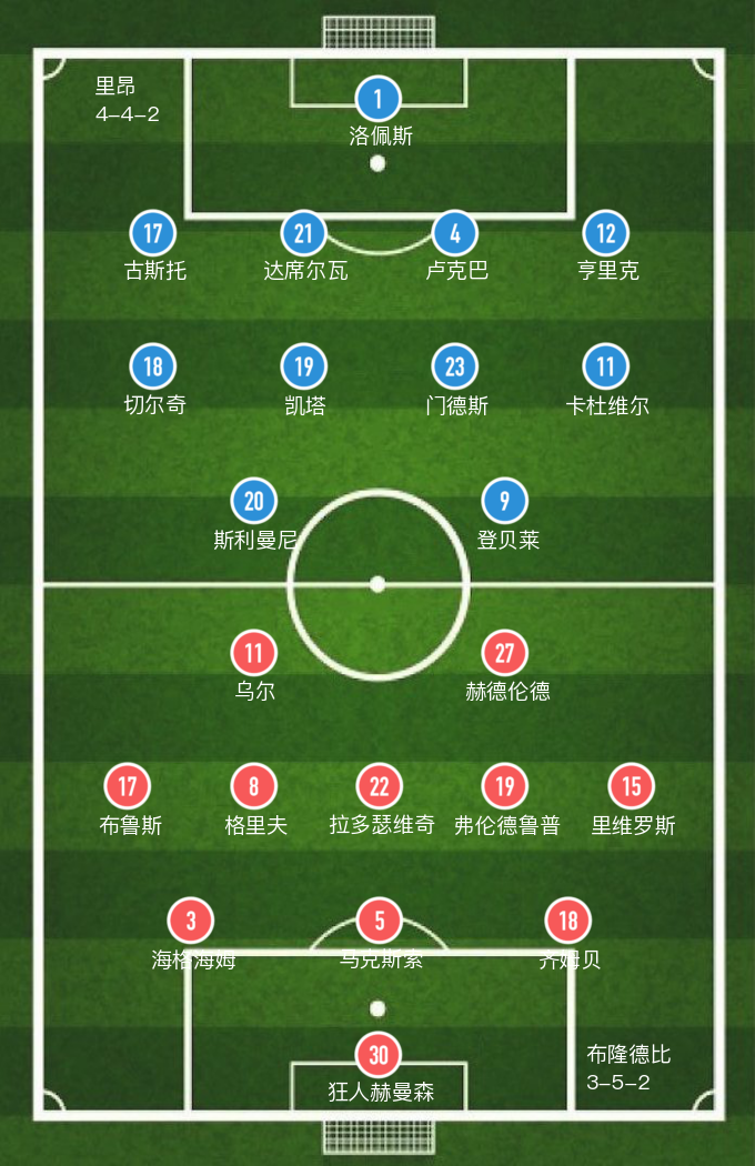 里昂(4-4-2): 1-洛佩斯,17-古斯托(87' 53-伯德),21-达席尔瓦,4-卢克巴,12-亨里克,18-切尔奇,19-凯塔(75' 25-卡克雷),23-门德斯(75' 39-吉马拉斯),11-卡杜维尔(75' 7-埃坎比),20-斯利曼尼,9-登贝莱(75' 10-帕奎塔)