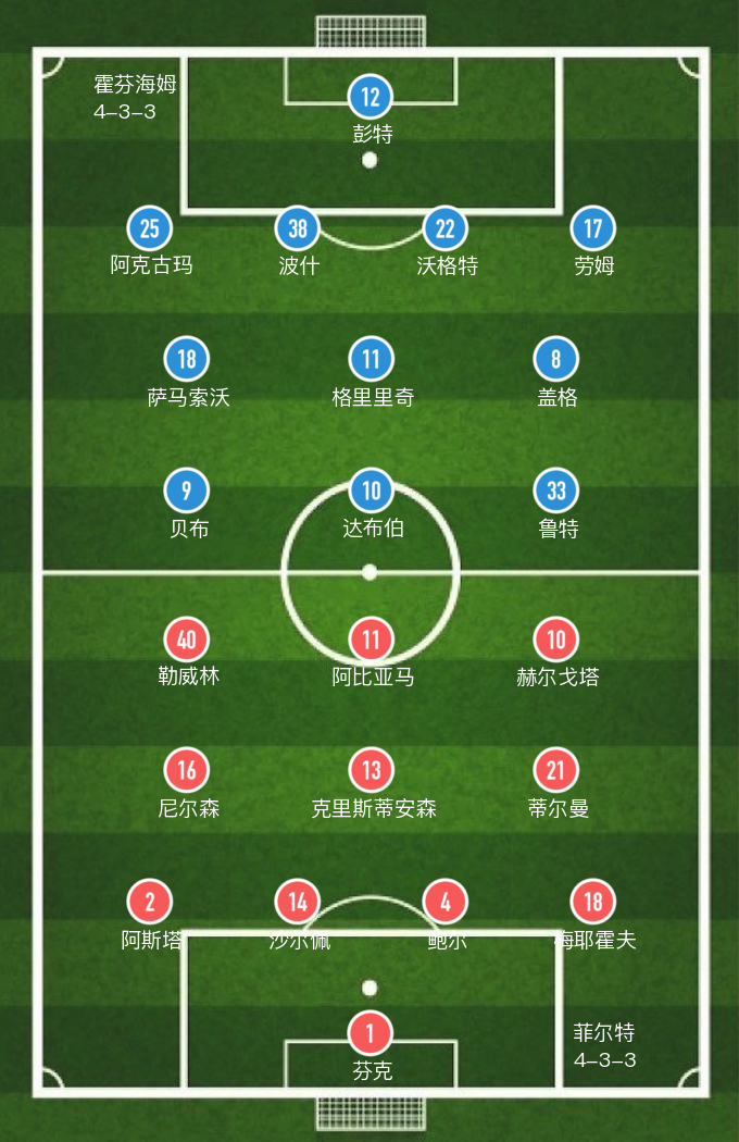 菲尔特(4-3-3): 1-芬克,2-阿斯塔(70' 32-巴里),14-沙尔佩,4-鲍尔,18-梅耶霍夫,16-尼尔森(87' 22-格里斯贝克),13-克里斯蒂安森,21-蒂尔曼(79' 28-杜齐亚克),40-勒威林,11-阿比亚马(70' 19-埃),10-赫尔戈塔