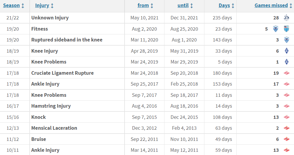 自10-11赛季以来,阿纳尼泽遭遇了13次伤病,包括踝部、膝关节、韧带等等,而需要伤停1个多月的重伤多达9次。其中17-18赛季遭遇的十字韧带撕裂,直接让他伤缺长达180天,缺阵了球队的19场比赛。