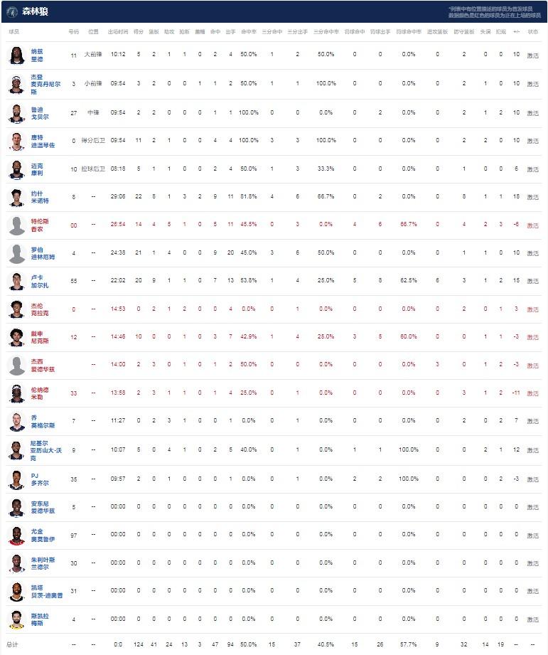 明尼苏达森林狼米诺特22分8板1助3断2帽,罗布-迪林厄姆21分1板4助,加尔扎20分9板1助1断。