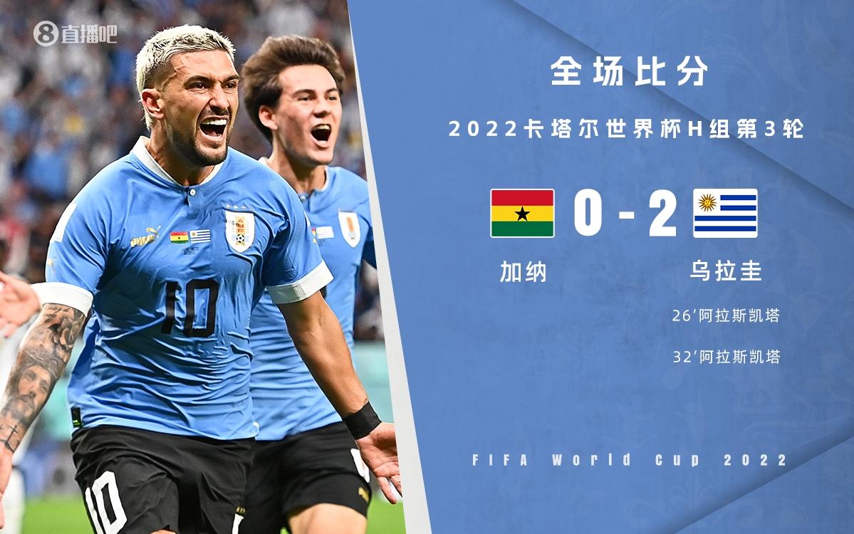 直播吧12月3日讯 北京时间12月2日23点,世界杯小组赛H组第三轮乌拉圭对阵加纳。上半场,库杜斯造点,安德烈阿尤主罚点球被罗切特扑出,随后阿拉斯凯塔完成梅开二度,本坦库尔伤退。下半场,佩里斯特里错失良机。全场比赛结束,乌拉圭2-0加纳。