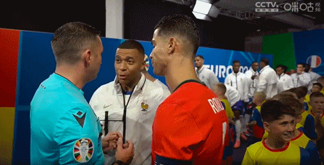 赛前,镜头给到双方队长C罗和姆巴佩。↓