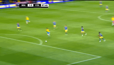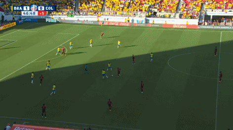 第72分钟,哥伦比亚后场开大脚,马尔基尼奥斯中场断球前送,内马尔禁区前沿顺势往前一抹形成直塞,帕奎塔禁区中路捅射破门,巴西队1-0领先!