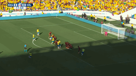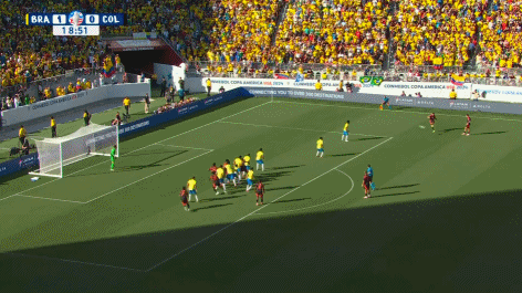 第55分钟,哥伦比亚换人,奎利亚尔换下身背黄牌的莫西卡。奎利亚尔刚上场就对内马尔犯规,送给巴西队前场右路任意球。内马尔主罚射门颇具威胁,奥斯皮纳飞身将球扑出底线。