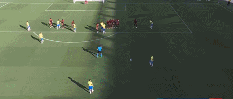 第12分钟,拉菲尼亚任意球直接破门,巴西1-0哥伦比亚