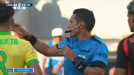 第22分钟,长时间回看VAR,哥伦比亚进球因越位在先被吹