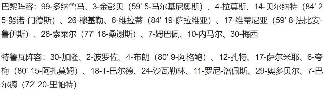 巴黎首发:99-多纳鲁马、3-金彭贝、4-拉莫斯、14-贝尔纳特、26-穆基勒、6-维拉蒂、17-维蒂尼亚、28-索莱尔、7-姆巴佩、10-内马尔、30-梅西