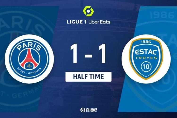 上半场比赛结束,巴黎圣日耳曼1-1特鲁瓦。