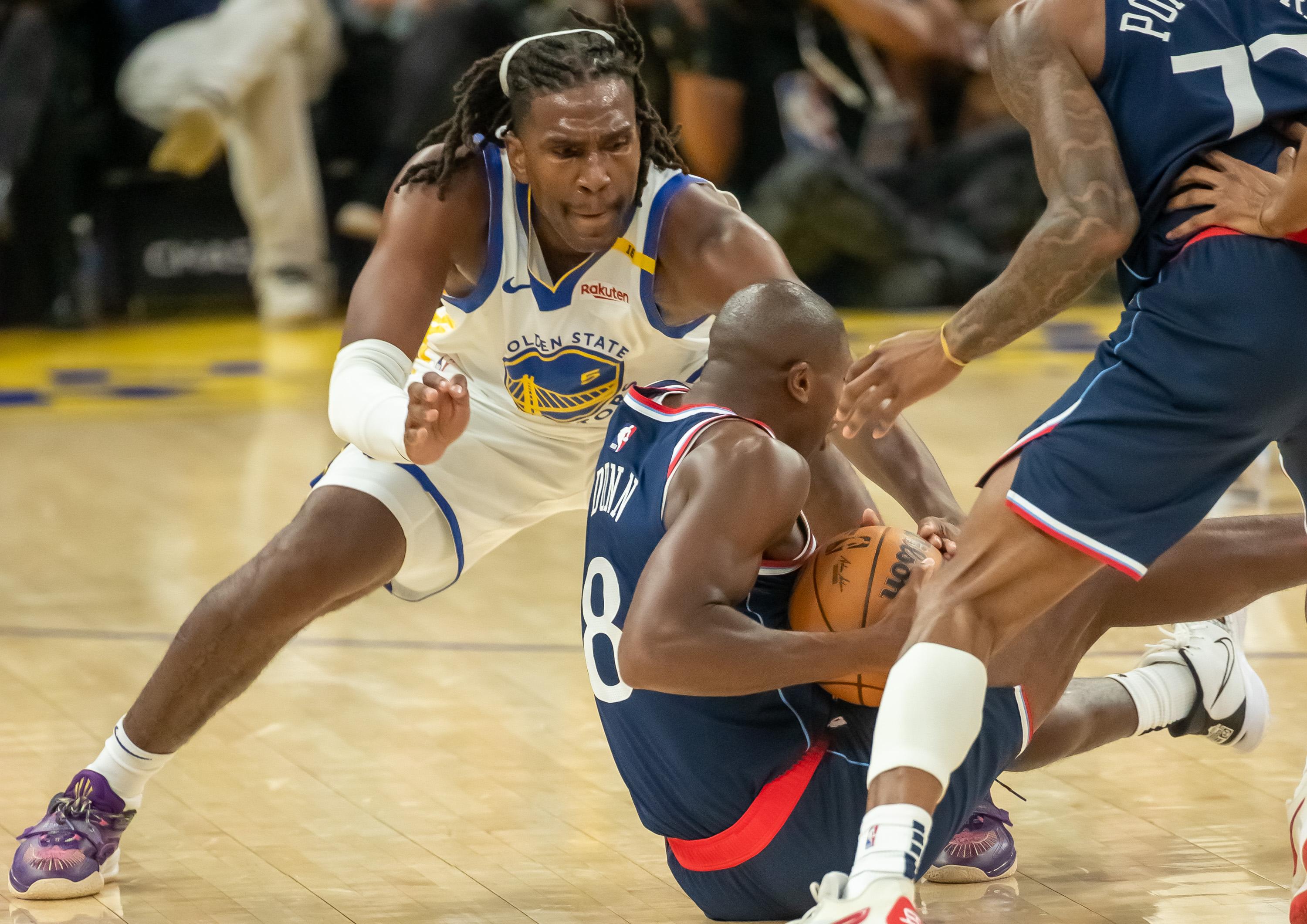 10月27日,金州勇士队球员鲁尼(左)在比赛中与洛杉矶快船队球员邓恩(下)拼抢。 新华社发(董旭东摄)
