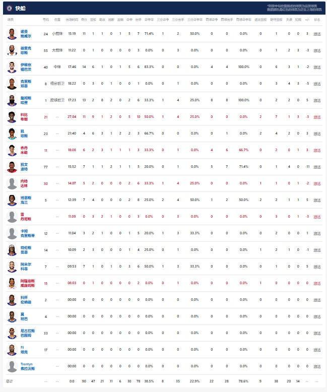 洛杉矶快船祖巴茨14分6板1助1帽,哈登13分2板8助2断,诺曼-鲍威尔11分1板1助1帽;