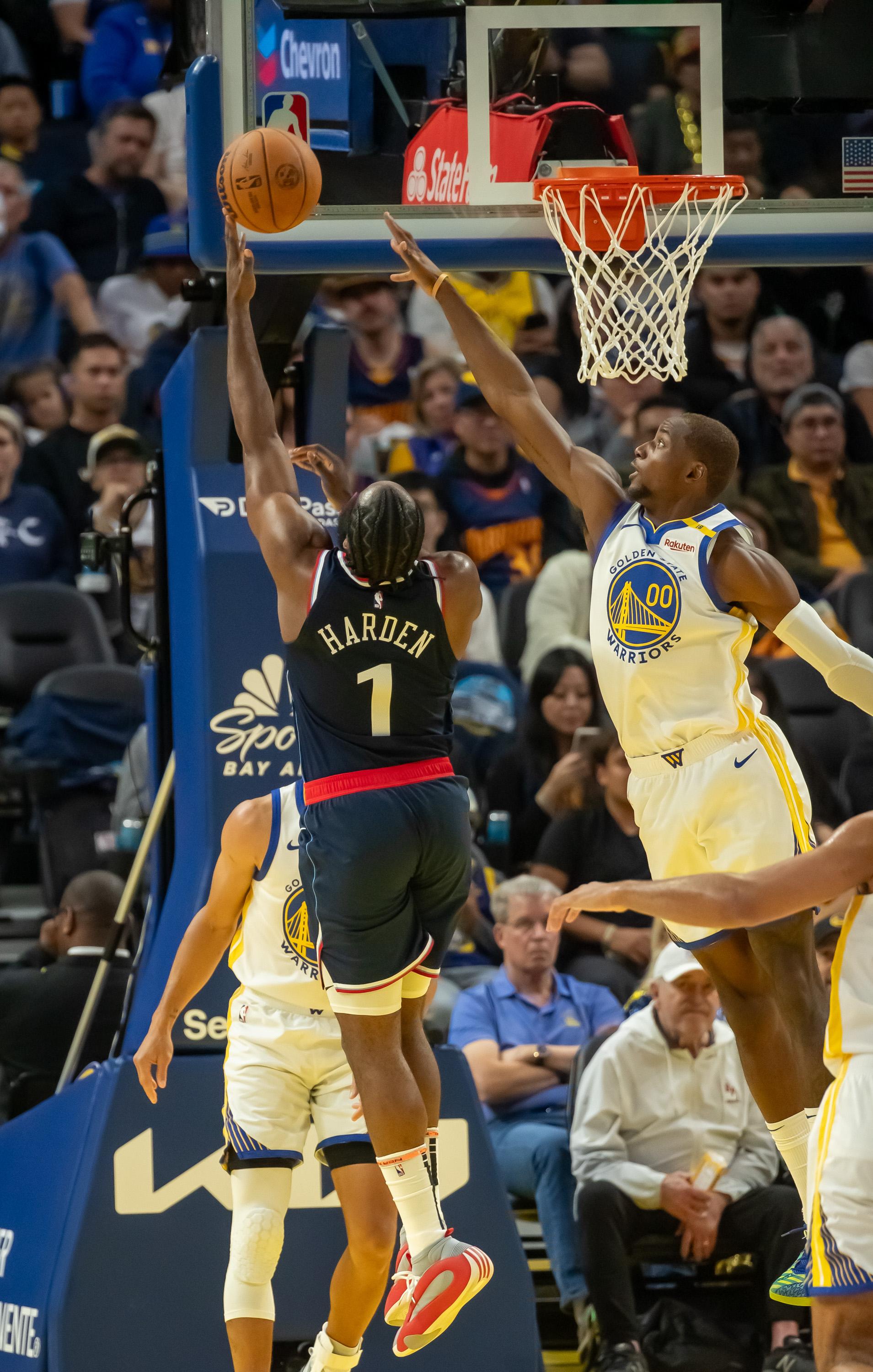 第一节快船哈登拿下9分,勇士库明加拿下5分,首节战罢快船26-23领先勇士