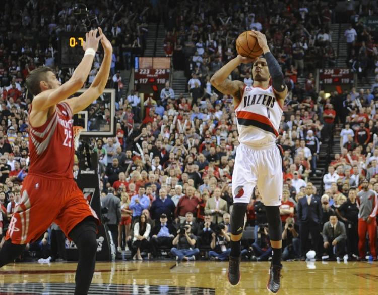 13-14赛季,火箭vs开拓者G6,哈登15中9得到34分4板6助,火箭98-99不敌开拓者——利拉德三分绝杀!