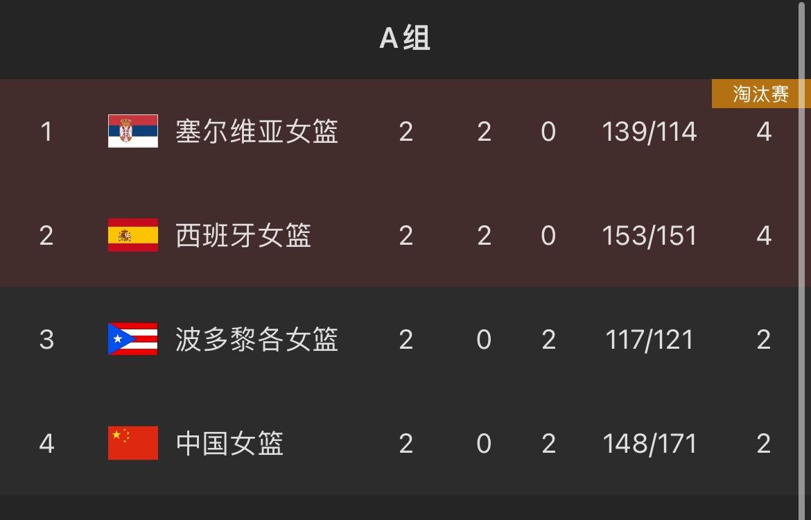 两队的小组前二都已经确定(塞尔维亚+西班牙、美国+德国),中国女篮与日本女篮情况非常相似,都需要力争小组第三,才有晋级的可能。