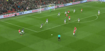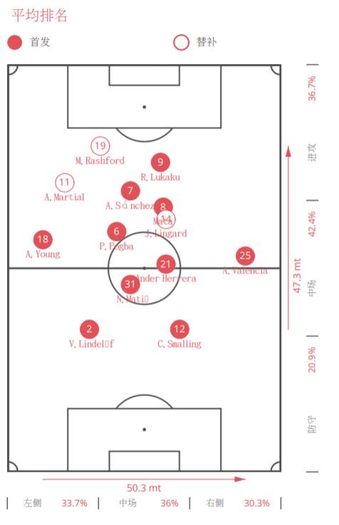 而穆里尼奥则使用了4-3-3阵型,博格巴-马蒂奇-埃雷拉在中场一字排开,桑切斯-卢卡库和马塔组成三叉戟。其中桑切斯和马塔活动范围很大,两人需要回到很深的位置拿球缓解中场的出球压力,或者内收到中路通过反复的穿插跑位配合完成射门。如上图曼联在比赛中的实际站位,两边基本交给两名边后卫,而注意力更多集中在中路组织和发起进攻,此役曼联非常注重小球渗透。
