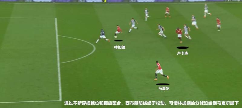 下半场随着马夏尔、林加德的登场,曼联的进攻形势有所好转,卢卡库在回撤接球做球时至少两边有球员可以快速的进行跑位配合。如上图的片段则是卢卡库吸引防守,随后林加德果断冲击西布朗身后空间,同时马夏尔在弱侧也积极插上,曼联通过换人丰富了进攻思路,可惜林加德最后的分球没有成功交给马夏尔。