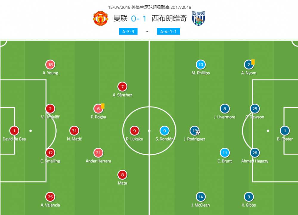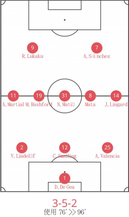 曼联:1-德赫亚;25-瓦伦西亚,2-林德洛夫,12-斯莫林,18-阿什利-扬(74’19-拉什福德);31-马蒂奇,21-埃雷拉(45’14-林加德),6-博格巴(57’11-马夏尔);8-马塔,7-桑切斯,9-卢卡库
