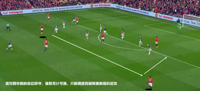 面对曼联的强势进攻,西布朗基本交出了控球权,甚至在中场也降低防守力度而集中力量去保护禁区及禁区前沿的位置。曼联虽然能流畅的将进攻推进到三十米区域,但面对西布朗的密集防守,还是没办法真正打开局面。卢卡库不断的回撤或者拉边希望带动防守,为队友前插制造空间,但西布朗的防线仍然保持的十分紧密。无奈之下曼联更多将球转移至弱侧,重新组织进攻。但过多在对方半场消耗,也增加了被反击的风险。