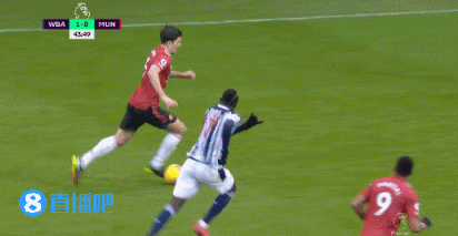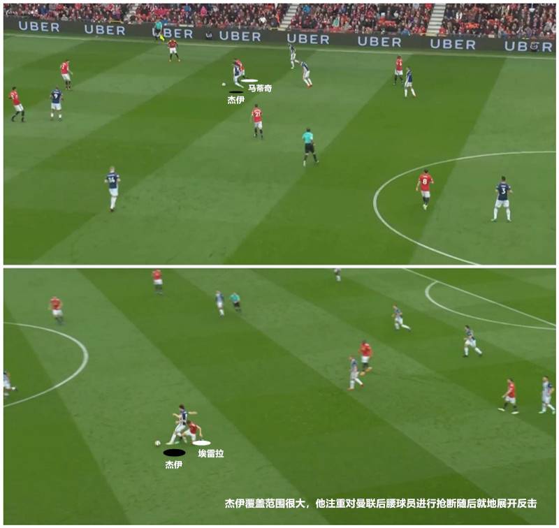 此役杰伊表现非常出色,他的跑动覆盖范围很大,既要积极回到本方半场防守,又要加强逼抢力度展开反击。如上图是杰伊依靠准确的预判和体格优势成功在曼联双后腰马蒂奇、埃雷拉脚下断球,随后迅速发起反击。