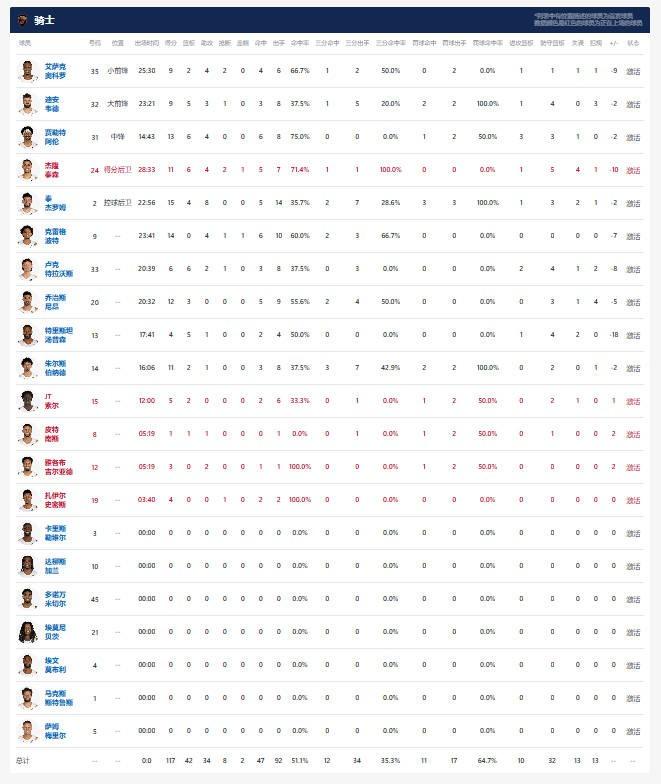 第四节骑士杰伦-泰森拿下6分,步行者怀斯曼拿下8分,最终骑士117-129不敌步行者