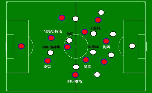 从模拟战术板上可以看到,使用433阵型的巴萨,在梅西站位伪九号的情况下,中场的控球能力、创造力达到最佳。锋线上的比利亚和佩德罗,有着很强的换位能力。结合右后卫阿尔维斯的前插助攻,达到进攻端接应点的最大化。曼联方面使用4411阵型,想要利用鲁尼为攻击核心,找寻进攻中的机会。