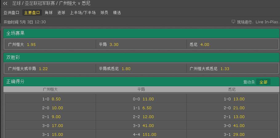 具体比分盘方面,两队1-1战平的赔率6.50是最低的,恒大1-0获胜的赔率是8.5,2-1为9.00,而悉尼1-0获胜的赔率都有13.00。
