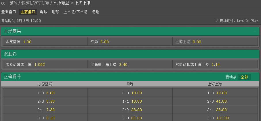 具体比分盘方面,水原1-0小胜赔率6.00是最低的,其次是2-0的6.50,3-0的赔率是8.50,4-0的赔率也不过15.00。而上港1-0的赔率都达到了19.00。