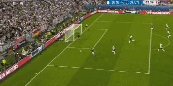 第68分钟,德国队禁区前不断传球后一脚调入禁区,戈麦斯反越位成功后胸部停球形成单刀,右脚脚后跟射门被布冯封出!