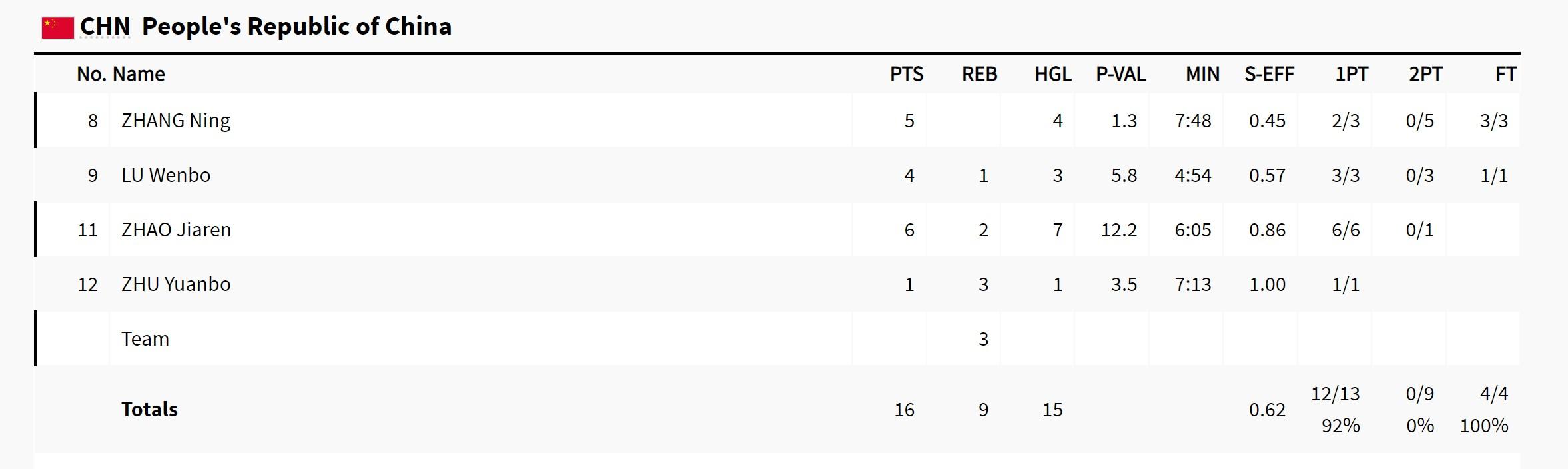中国男篮数据:张宁5分、陆文博4分、赵嘉仁6分2篮板、朱渊博1分3篮板