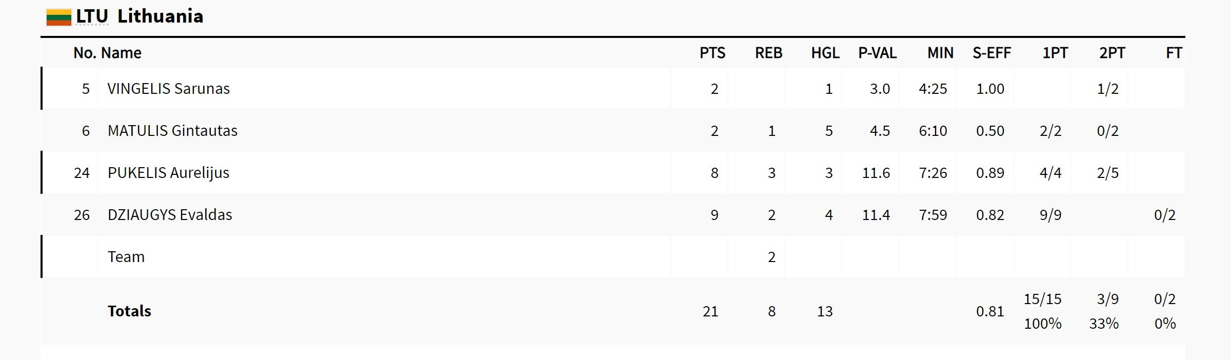 本场比赛立陶宛开局便给中国队当头一棒,中国队状态不佳,张宁甚至出现了接球走步的低级失误,中国队开场便1-8落后,随后中国队打出了一些不错的配合,但立陶宛的配合经常能创造篮下空篮的机会。陆文博完成双手暴扣,极大提振了球队士气,赵嘉仁也连续上篮打成,但立陶宛的得分势头并没有被抑制住。比赛最后时刻,张宁突破被吹罚走步,随后中国队犯规,已经得到19分的立陶宛获得两次罚球机会,但球员两罚不中,中国队又重获一丝希望,张宁罚球打进,中国追到16分,但立陶宛两分球命中收下比赛。