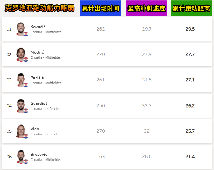 如果要比平均跑动距离,克罗地亚连西班牙的前5都进不去。