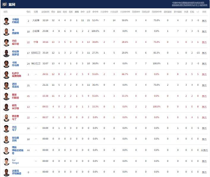 布鲁克林篮网卡梅隆-约翰逊32分4板4助1帽,托马斯13分4板3助1断,杰伦-威尔逊13分4板5助;