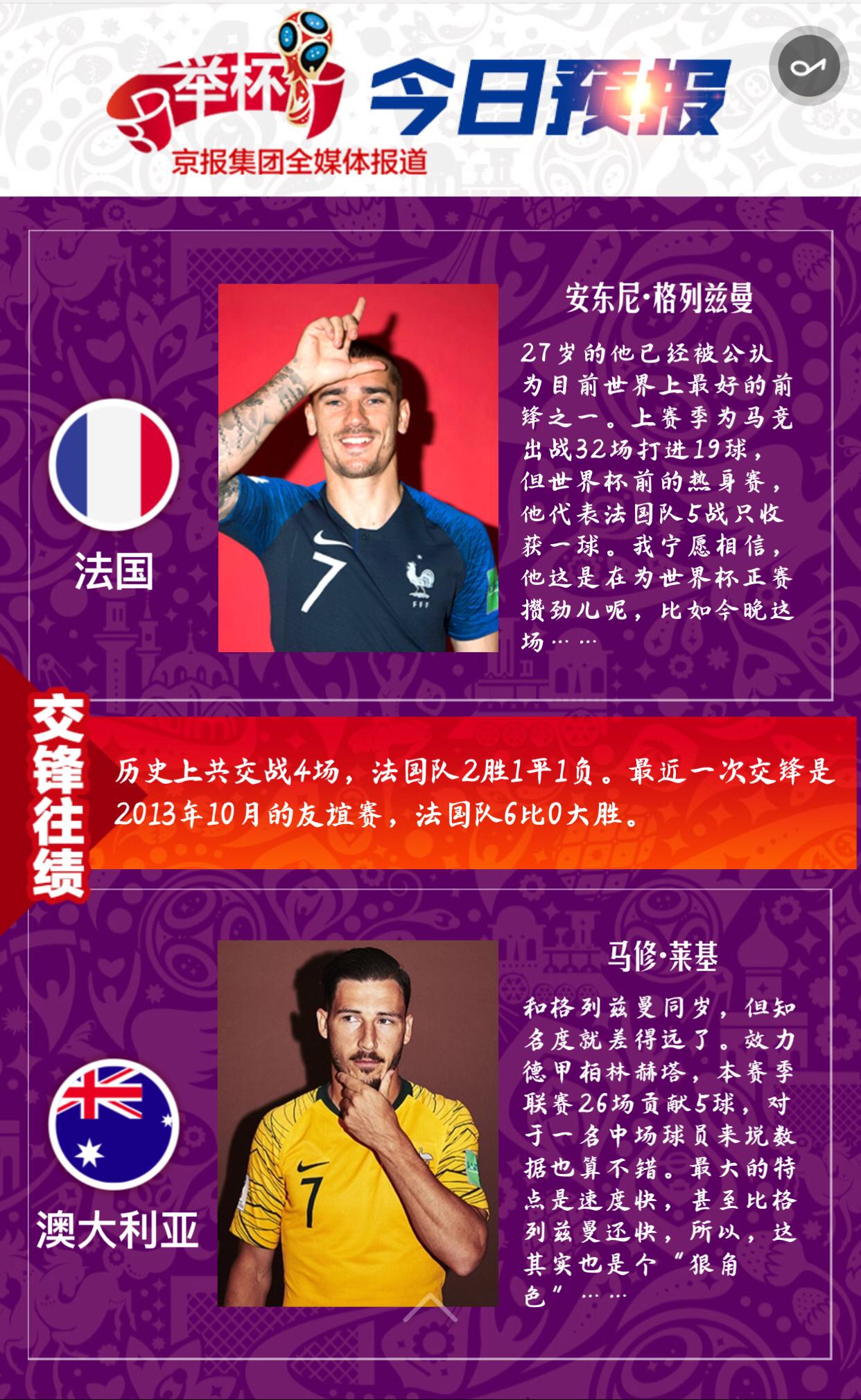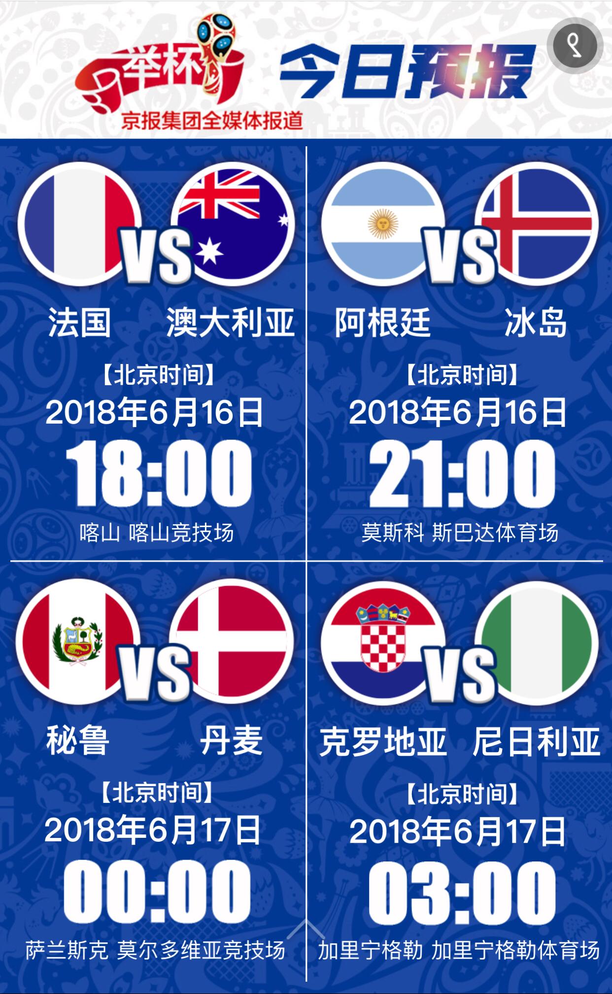 另外,除去这场焦点之争,还将有今晚还有法国vs澳大利亚(2018年6月16日18:00)。以及明天凌晨的秘鲁VS丹麦(2018年6月17日 00:00)、克罗地亚vs尼日利亚(2018年6月17日03:00)几场精彩对决即将上演,一起为世界杯狂欢吧!