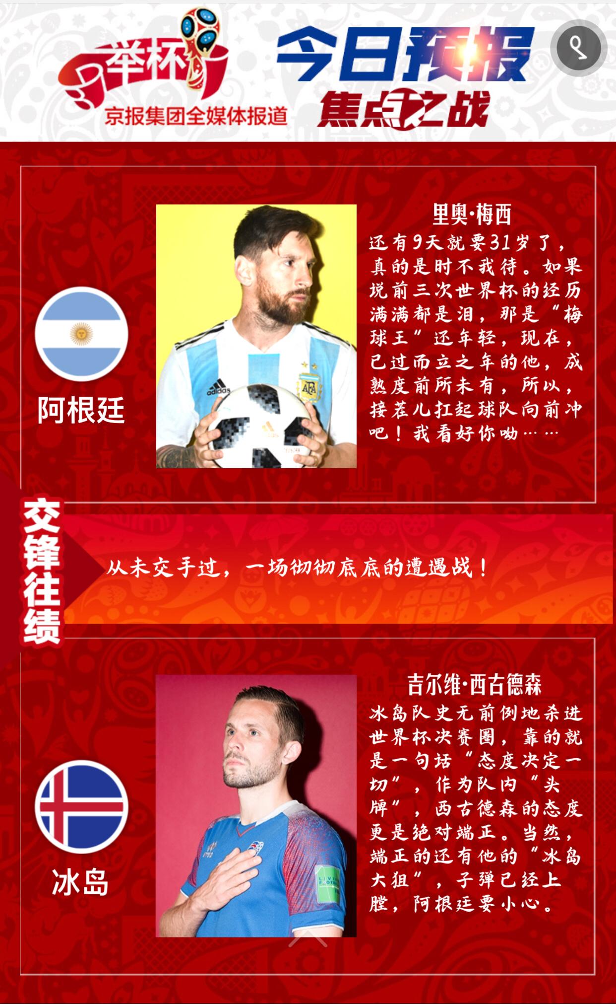 从未交手过的两队,即将面临一场彻彻底底的遭遇战!黑马冰岛队史无前例地杀进世界杯决赛圈,靠的就是一句话“态度决定一切”,作为队内“头牌”,西古德森的态度更是绝对端正。当然,端正的还有他的“冰岛大狙”,子弹已经上膛,阿根廷要小心。不过想必已过而立之年的“梅球王”也绝对能够扛起重任,带领阿根廷队冲向胜利。梅西啊,加油啊!再拿不着那个大力神杯,你可就老喽!