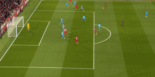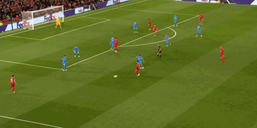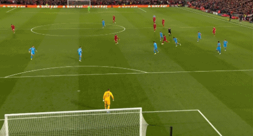 第8分钟,利物浦取得领先。罗伯逊左路传中弹地后来到右路,萨拉赫带球内切连过三人,来到中路禁区前沿,左脚大力抽射经折射弹入球门左下角,利物浦1-0领先 !萨拉赫连续9场比赛破门,成利物浦连续进球纪录第一人。