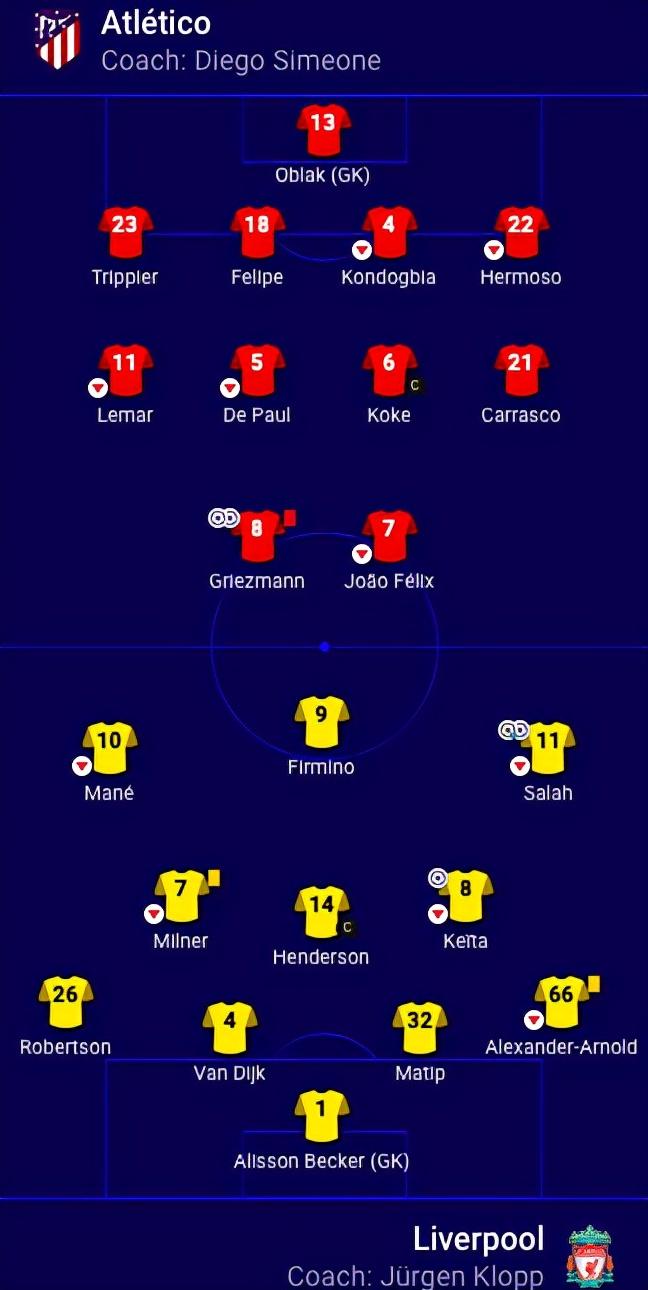马德里竞技首发:13-奥布拉克;22-埃尔莫索、2-吉梅内斯、18-费利佩;23-特里皮尔、6-科克、5-德保罗、21-卡拉斯科、10-科雷亚、7-菲利克斯;9-苏亚雷斯