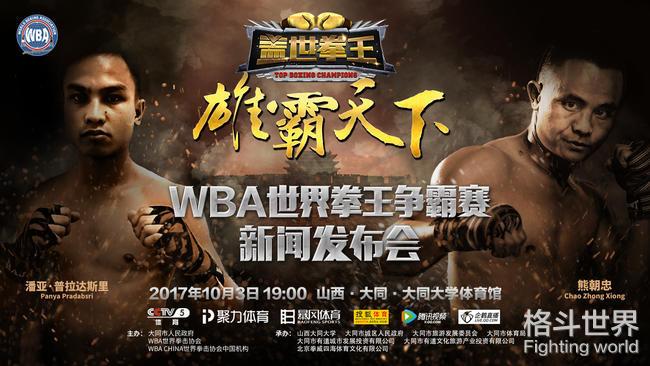 2017年9月8日下午,“盖世拳王•WBA世界拳王争霸赛”新闻发布会在山西大同中国雕塑博物馆召开,在本次赛事主题为“雄霸天下•天下大同”的发布会现场。中国首位世界拳王熊朝忠现场宣布,将在10月3日,在大同市大学体育馆,与泰国选手潘亚·普拉达斯里打响自己复出的第一战。