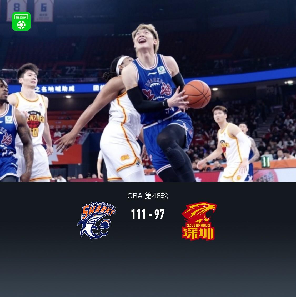 第四节上海李弘权拿下9分,深圳达柳斯-亚当斯拿下10分,最终上海111-97战胜深圳