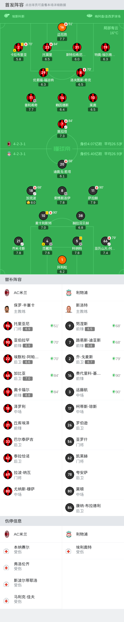 在欧洲冠军联赛小组赛首轮的较量中,AC米兰迎战利物浦。比赛中,AC米兰的普利希奇率先破门,为球队取得领先。随后,利物浦的科纳特和范戴克相继进球,帮助球队反超比分。半场结束时,场上比分为AC米兰1-2利物浦。