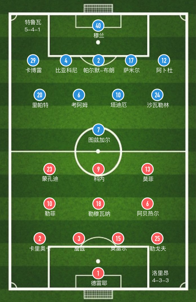 特鲁瓦(5-4-1): 40-穆兰,29-卡博雷,4-比亚科尼(63' 25-巴尔德),2-帕尔默-布朗,17-萨米尔,12-阿卜杜(81' 23-拉米),20-里帕特,6-考阿姆,10-塔迪厄,24-沙瓦勒林(63' 22-拉鲁奇),7-图兹加尔(82' 13-乌戈博)
