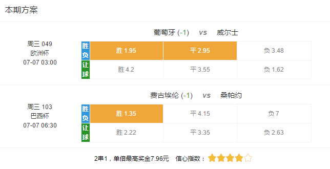 今晚欧洲杯半决赛打响第一场,葡萄牙VS威尔士欧平2.16 3.04 3.92,主胜和平赔明显较低,威尔士胜赔偏高。当然威尔士已经制造了多场冷门,似乎不能因为赔率高就忽视客胜可能。但从概率上说,威尔士连续3场取胜打出高赔的可能性很小,而且阵容方面,他们少了拉姆塞和本•戴维斯,要再进一步很难。但同样有意思的是,现在有消息称C罗可能因伤缺席,似乎让胜负天平又变得相对均衡。不过,这个消息有望令葡萄牙热度降低。而且外界似乎颇期待葡萄牙连平进决赛甚至夺冠,另外本届赛事平/半全出下盘,这都有利于此战上盘热度趋于缓和。此战单关策略博主胜,若串关,则可双选胜/平,3个半小时后巴西杯费古埃伦斯VS桑帕约科雷亚的主胜可作为串关的另一个搭配选项。