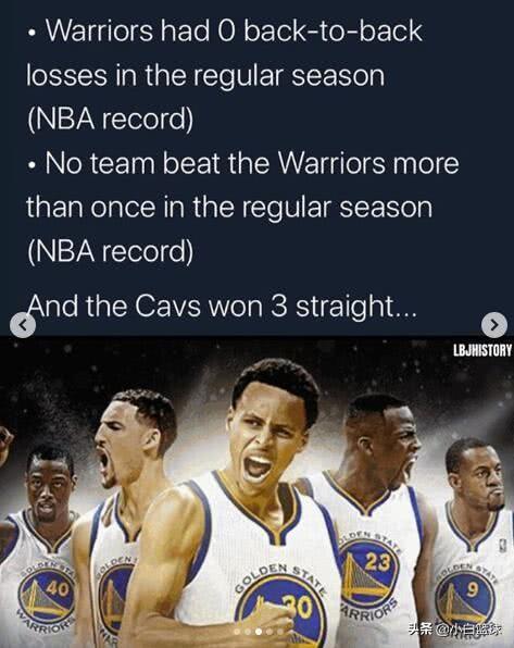 15-16赛季的金州勇士队常规赛没有连败过(NBA纪录);在15-16赛季常规赛中没有任何一支球队击败过勇士队两次(NBA纪录),而骑士队不仅击败了勇士队4场,还连赢了勇士3场!PS:在西决中雷霆曾连胜过勇士队两场,一共赢了勇士三场。