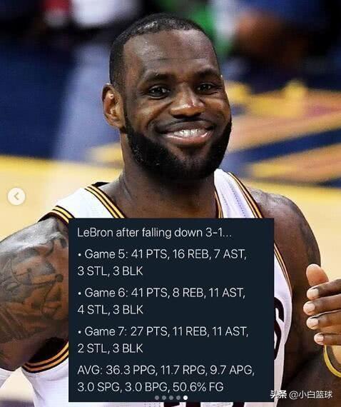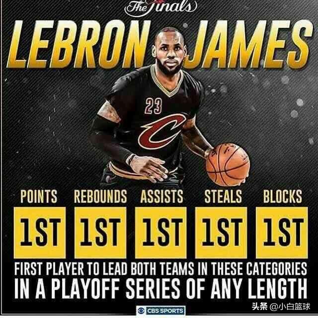 值得一提的是2016年总决赛的詹姆斯,场均29.7分11.3篮板8.9助攻2.6抢断2.3盖帽,命中率49.4%,三分命中率37.3%,五项数据都是两队第一,这也是NBA历史上首次有人在总决赛做到得分、助攻、篮板、抢断、盖帽都拿下两队第一,强如迈克尔-乔丹也未能做到。