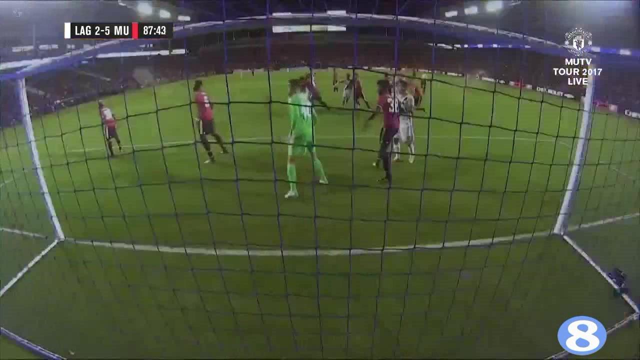 第72分钟,曼联反击机会,林德洛夫一脚斜长传,找到右路的门萨,门萨底线附近送出倒三角回传,找到禁区内中路跟上的马夏尔,马夏尔禁区内一脚抽射,球进了,曼联5-0洛杉矶银河。