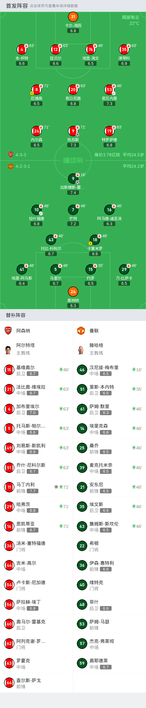 第70分钟,连换三人!恩凯蒂亚、哈弗茨、马丁内利替补登场