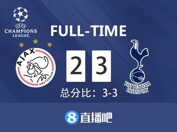 5分钟补时后全场比赛结束,最终热刺3-2逆转阿贾克斯,总比分3-3凭借客场进球的优势挺进决赛。