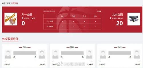 @央视网体育 10月18日消息,北京时间10月18日,据CBA官方赛程显示,今天下午15:30,八一男篮对阵北京首钢的比赛,由于八一男篮在开赛后15分钟未能到达比赛现场,根据规则该比赛直接判为八一0-20负于北京。